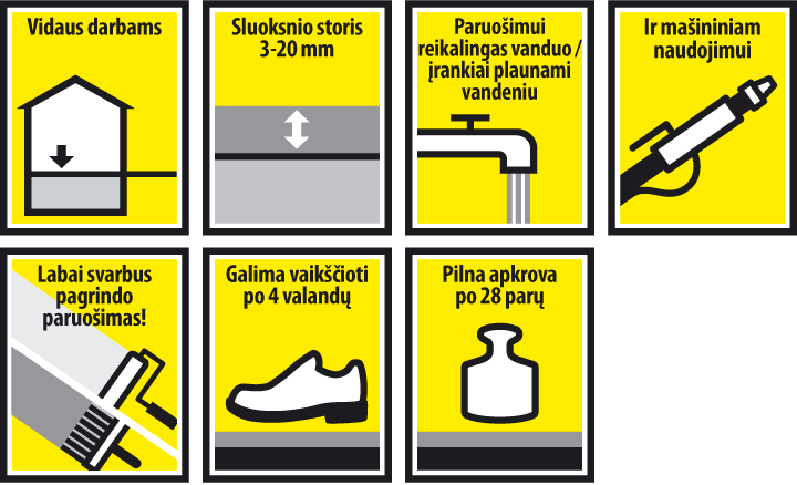 - Išlygintą paviršių galima dengti įvairiomis grindų dangomis (plytelių, PVC, linoleumo, parketo ir pan.).