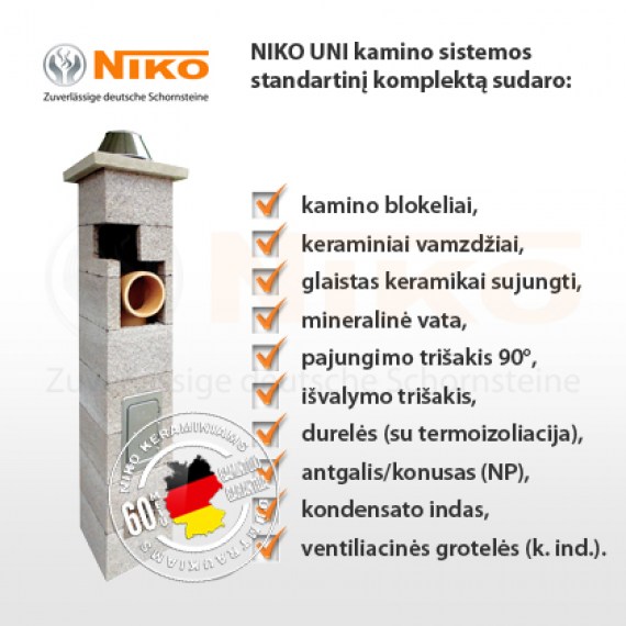 NIKO UNI universali kamino sistema tinka visiems šildymo įrenginiams (katilams, židiniams, krosnims), kūrenamiems: dujomis, skystuoju, kietuoju kuru (akmens anglimi, malkomis, briketais, granulėmis, biomase). NIKO UNI universali kamino sistema itin atspari aukštoms darbinėms temperatūroms iki 600°C, atspari suodžių užsidegimui, taip pat ilgalaikiam agresyvaus kondensato poveikiui.