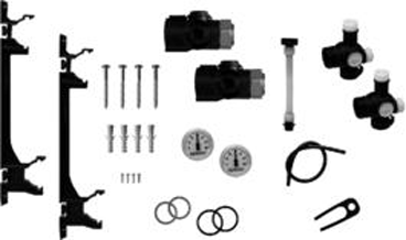 Uponor plastikinio kolektoriaus laikikliai, tarpinės, du termometrai ir nuorinimo, užpildymo, išleidimo, ir apėjimo vožtuvai, bei tvirtinimo elementai.